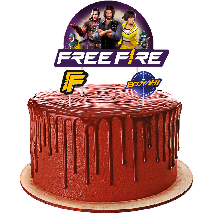 Um pacote contendo 4 unidades de topo para bolo com o tema Free Fire
