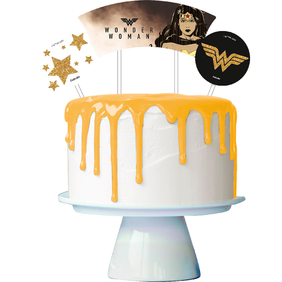 Um pacote contendo 4 unidades de topo para bolo com o tema Mulher Maravilha