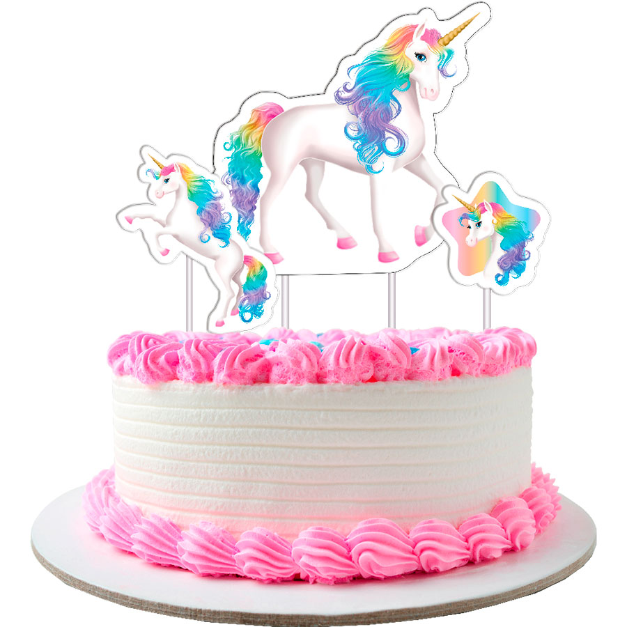 Um pacote contendo 4 unidades de topo para bolo com o tema Unicórnio