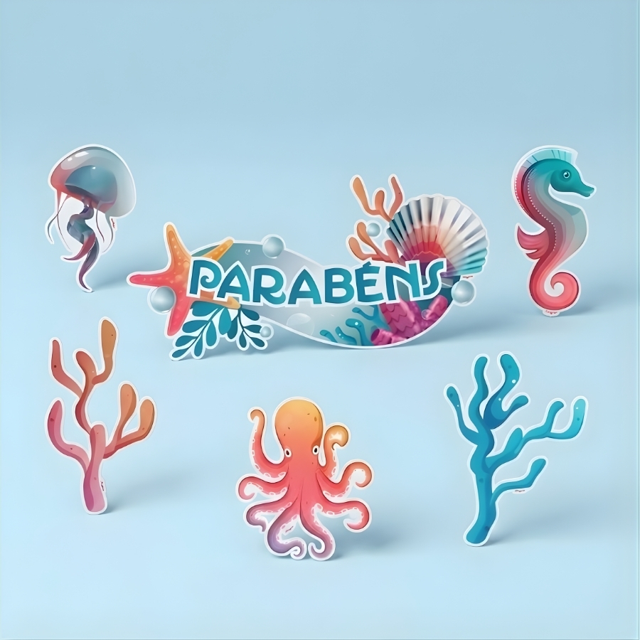 A Decoração Topo de Bolo - Fundo do Mar é a escolha perfeita para transformar o bolo em um verdadeiro destaque da sua festa. Inspirada no universo marinho, ela traz um visual encantador e cheio de detalhes, deixando a comemoração mais temática e envolvente.