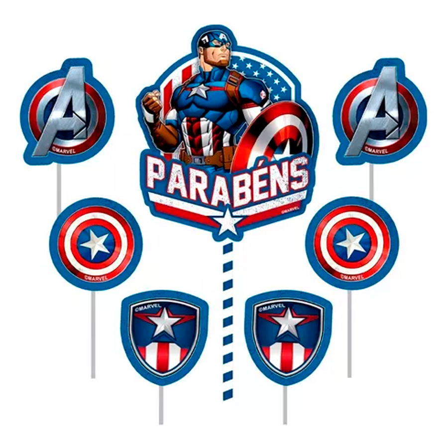 Possui 7 topo de bolo impresso em E.V.A no tem Cingadores Capitão América