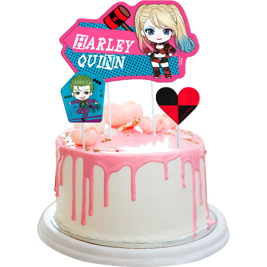 Um pacote contendo 4 unidades de topo para bolo com o tema Arlequina