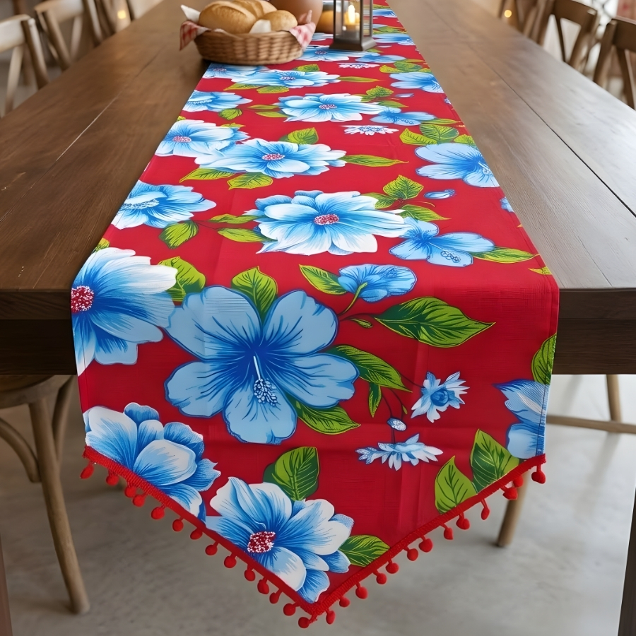 Caminho de mesa com estampa chita nas cores vermelho e azul, com padrão floral. Possui dimensões aproximadas de 39x130cm. Indicado para uso decorativo em mesas durante festas juninas e eventos temáticos. Produto leve e de fácil aplicação. Recomenda-se evitar contato com umidade excessiva e objetos que possam danificar o material.