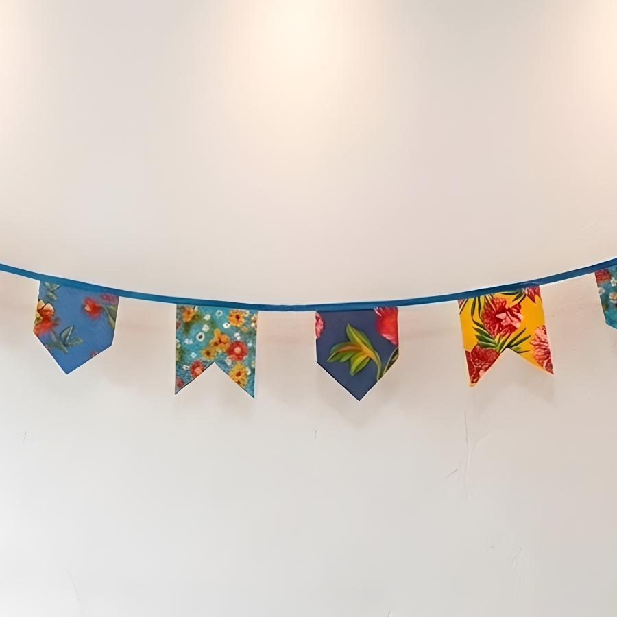 Varal decorativo com 10 bandeiras em estampa chita e cordão na cor azul claro. Possui comprimento aproximado de 270cm. Indicado para uso em decoração de festas e eventos temáticos, podendo ser aplicado em ambientes internos ou externos cobertos. Produto leve e de fácil instalação. Recomenda-se evitar contato com umidade e manusear com cuidado para preservar o material. As estampas de chita são sortidas e podem divergir da foto.