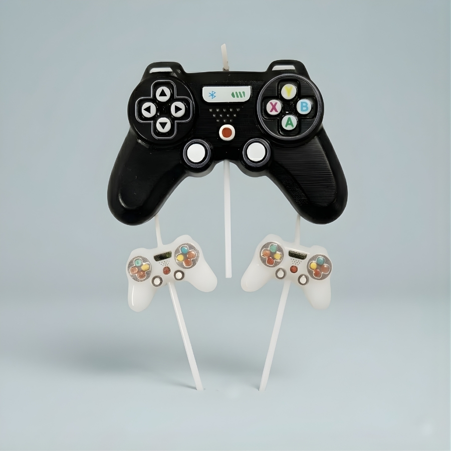 Vela decorativa para bolo com formato de controle de videogame, nas cores preto e branco, com dimensões aproximadas de 9x8cm. Indicada para uso em bolos de aniversário ou composições decorativas em festas temáticas. Produto destinado ao uso durante celebrações. Recomenda-se posicionar a vela em superfície estável antes de acender, manter afastada de materiais inflamáveis e utilizar sob supervisão de um adulto.