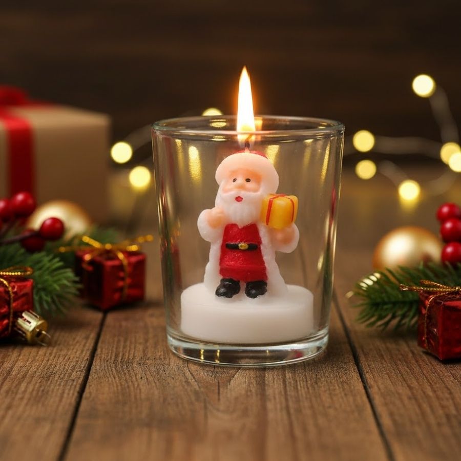 Vela decorativa com Papai Noel segurando presente, compacta, detalhada e ideal para composições natalinas.
