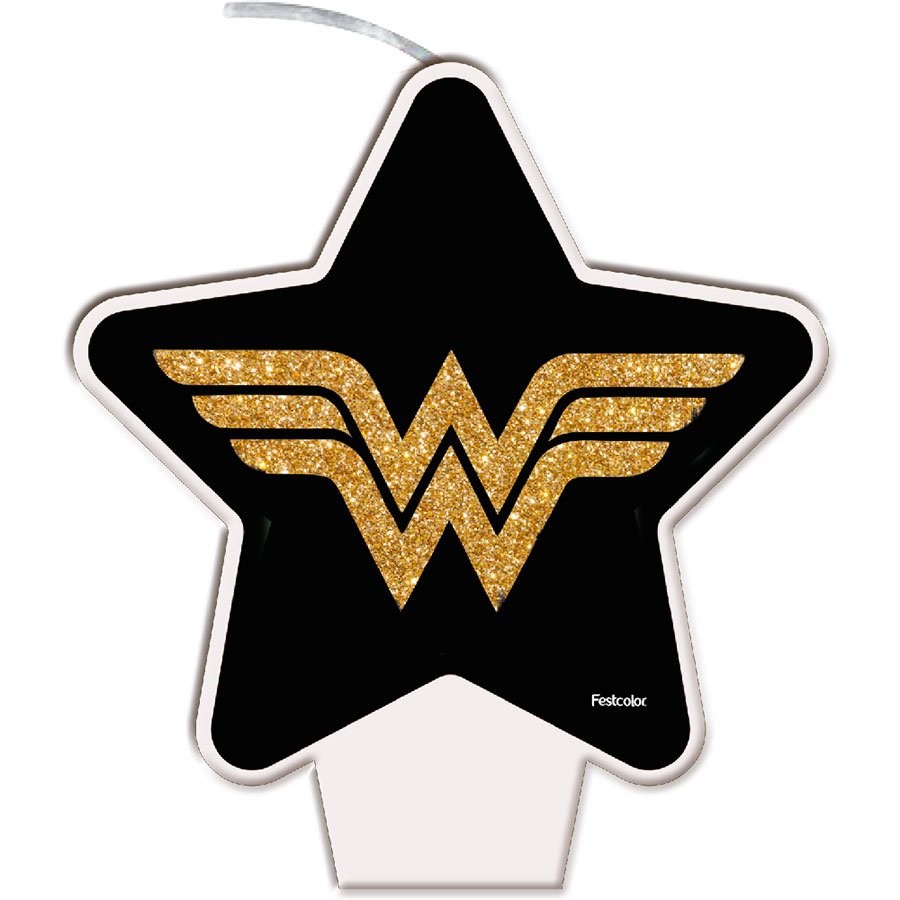 Um pacote contendo 1 unidade de uma vela adesivada com o tema Mulher Maravilha Luxo