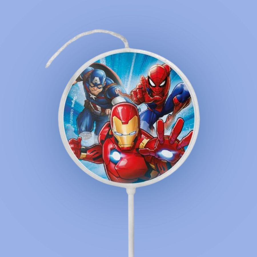 Vela plana adesivada com suporte tipo pick e estampa dos Avengers da Marvel, ideal para decorar bolos de aniversário em festas infantis temáticas de super-heróis, trazendo destaque e praticidade para a decoração.
