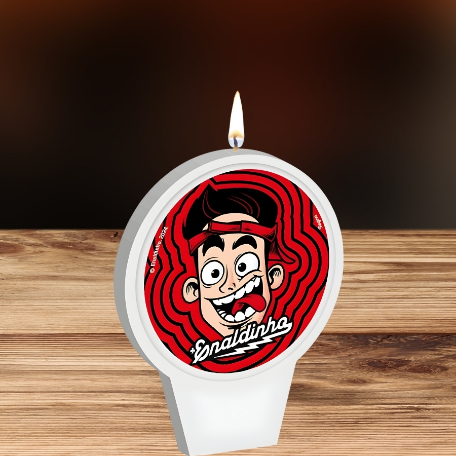 Vela plana com tema Enaldinho, dimensões 7x8,5cm. Leve, prática e segura, ideal para decorar bolos, mesas e festas temáticas inspiradas no influenciador.