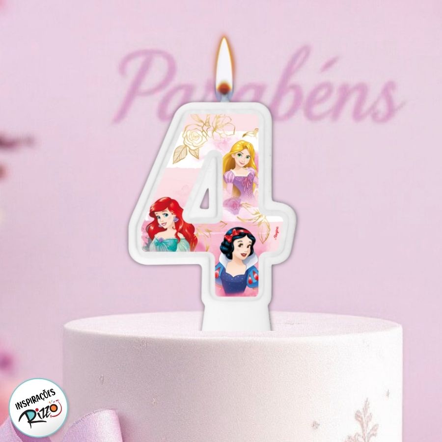 Vela decorativa inspirada nas Princesas Disney, ideal para aniversários infantis com o charme das personagens mais amadas. Com 9cm de altura, apresenta o número 4 em destaque e vem decorada com estampa das Princesas Disney, em cores vibrantes e acabamento delicado.