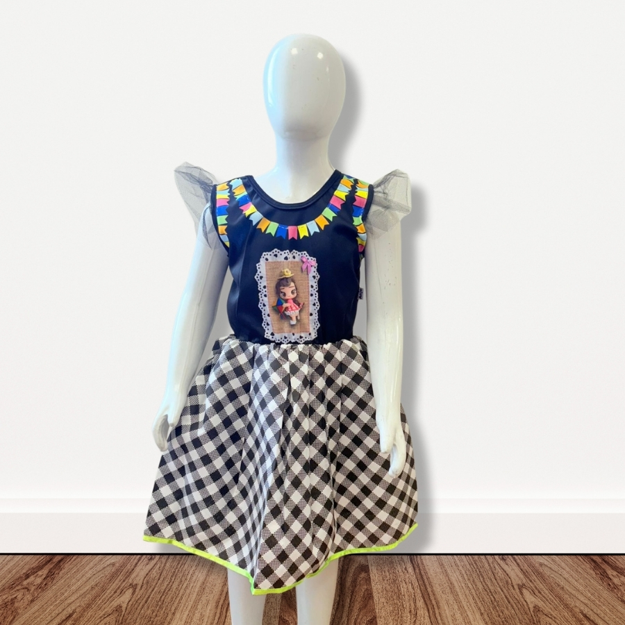 Vestido infantil temático para Festa Junina, modelo Bonequinha, nas cores preto e xadrez. Tamanho G (8 a 10 anos). Produzido em material leve e confortável, ideal para quadrilhas, festas escolares e eventos juninos.
